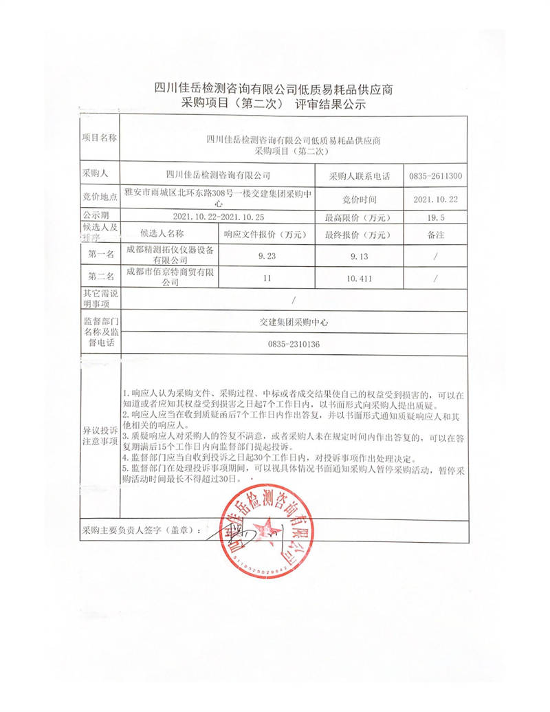 四川佳岳檢測(cè)咨詢有限公司低質(zhì)易耗品供應(yīng)商采購(gòu)項(xiàng)目(第二次)評(píng)審結(jié)果公示