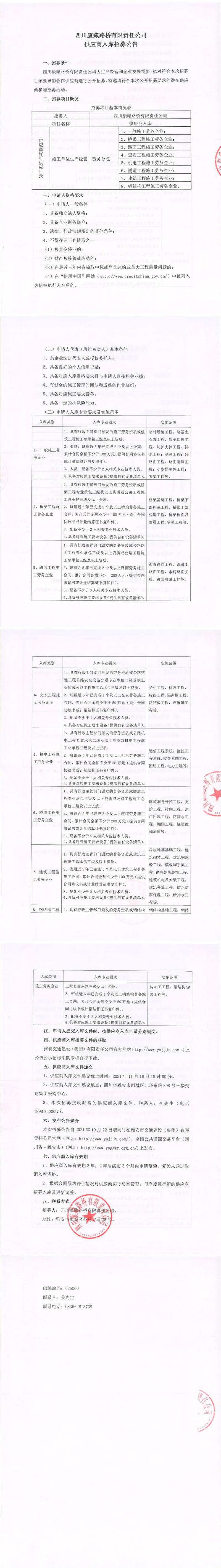 四川康藏路橋有限責任公司供應商入庫招募公告