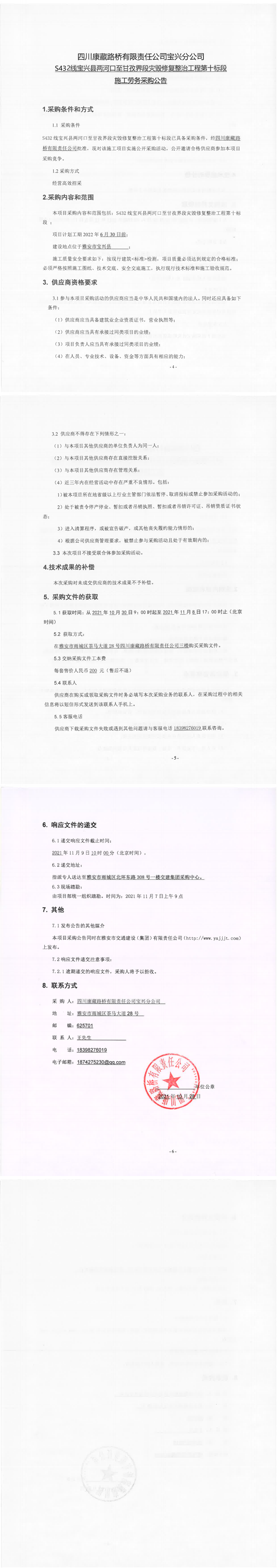 四川康藏路橋有限責任公司寶興分公司S432線寶興縣兩河口至甘孜界段災毀修復整治工程第十標段施工勞務采購公告