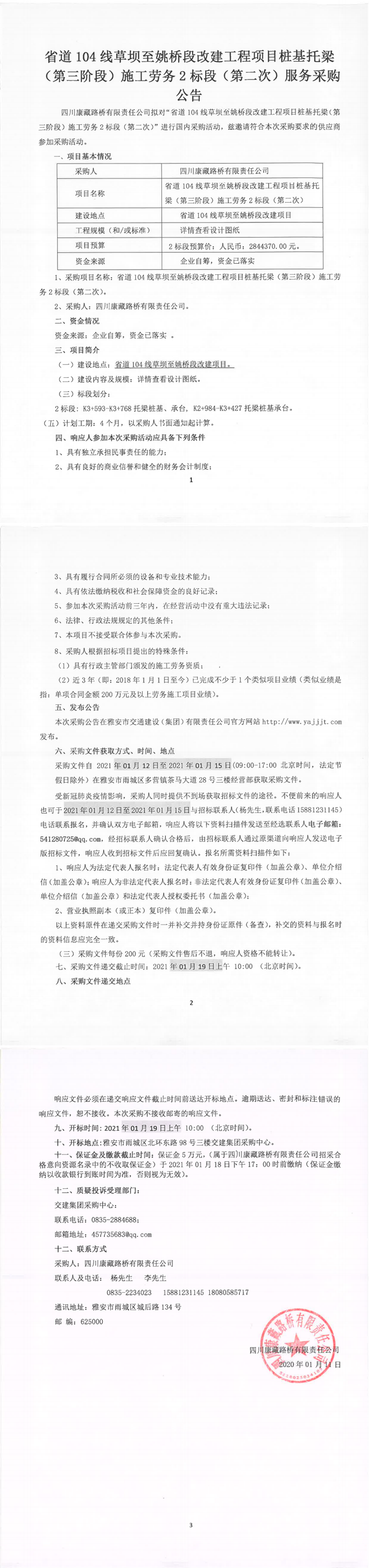 四川康藏路橋有限公司省道104線草壩至姚橋段改建工程項目樁基托梁(第三階段)施工勞務2標段(第二次)服務采購公告