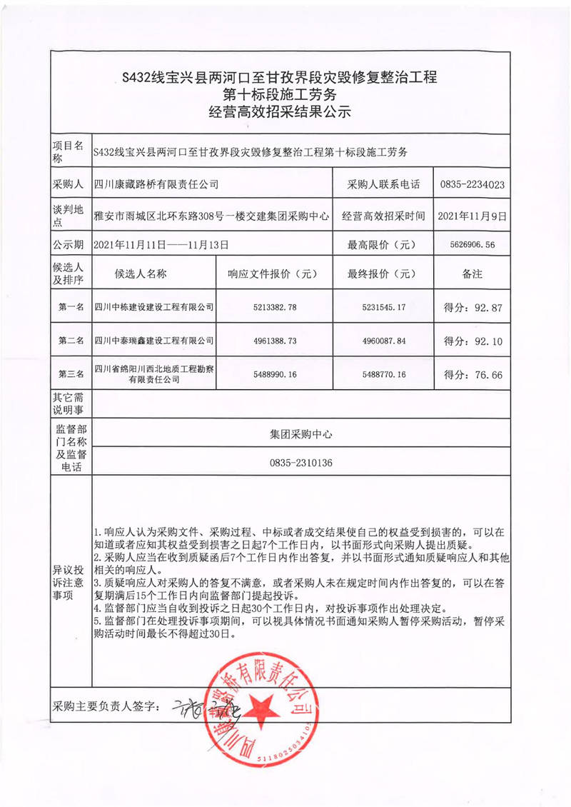 四川康藏路橋有限責任公司S432線寶興縣兩河口至甘孜界段災毀修復整治工程第十標段施工勞務經(jīng)營高效招采結果公示