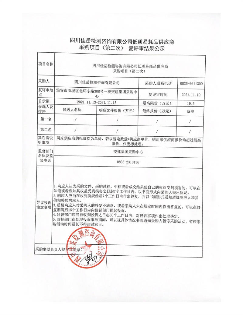 四川佳岳檢測(cè)咨詢(xún)有限公司低質(zhì)易耗品供應(yīng)商采購(gòu)項(xiàng)目(第二次)復(fù)評(píng)審結(jié)果公示