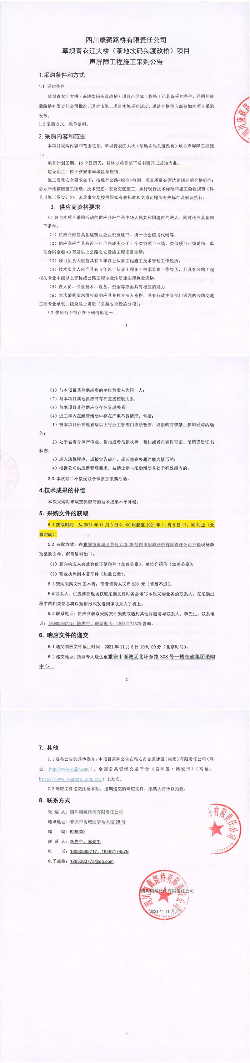 四川康藏路橋有限責(zé)任公司草壩青衣江大橋(茶地坎碼頭渡改橋)項(xiàng)目聲屏障工程施工競爭談判采購公告