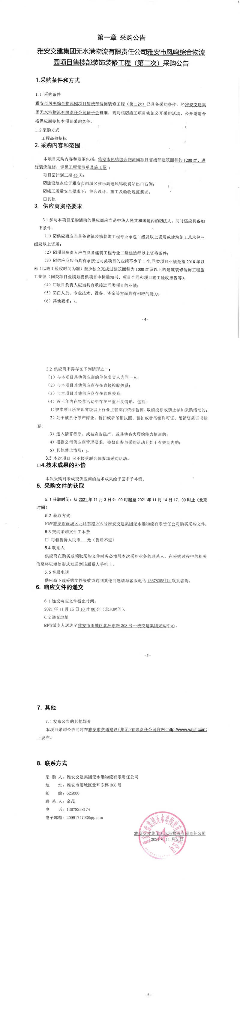 雅安交建集團無水港物流有限責(zé)任公司雅安市鳳鳴綜合物流園項目售樓部裝飾裝修工程(第二次)采購公告