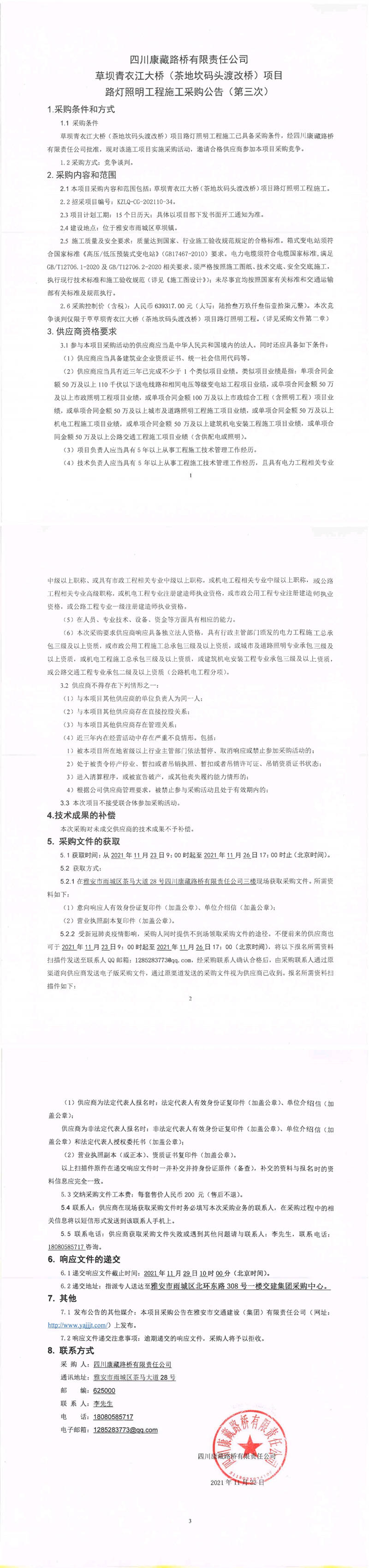 四川康藏路橋有限責(zé)任公司草壩青衣江大橋(茶地坎碼頭渡改橋)項(xiàng)目路燈照明工程施工采購公告(第三次)