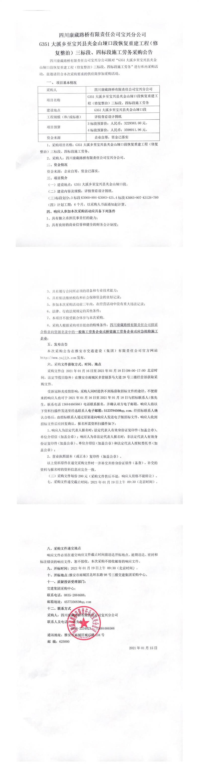 四川康藏路橋有限責(zé)任公司寶興分公司G351線寶興縣大溪鄉(xiāng)至寶興縣夾金山埡口段恢復(fù)重建工程(修復(fù)整治)三標(biāo)段、四標(biāo)段施工勞務(wù)采購公告