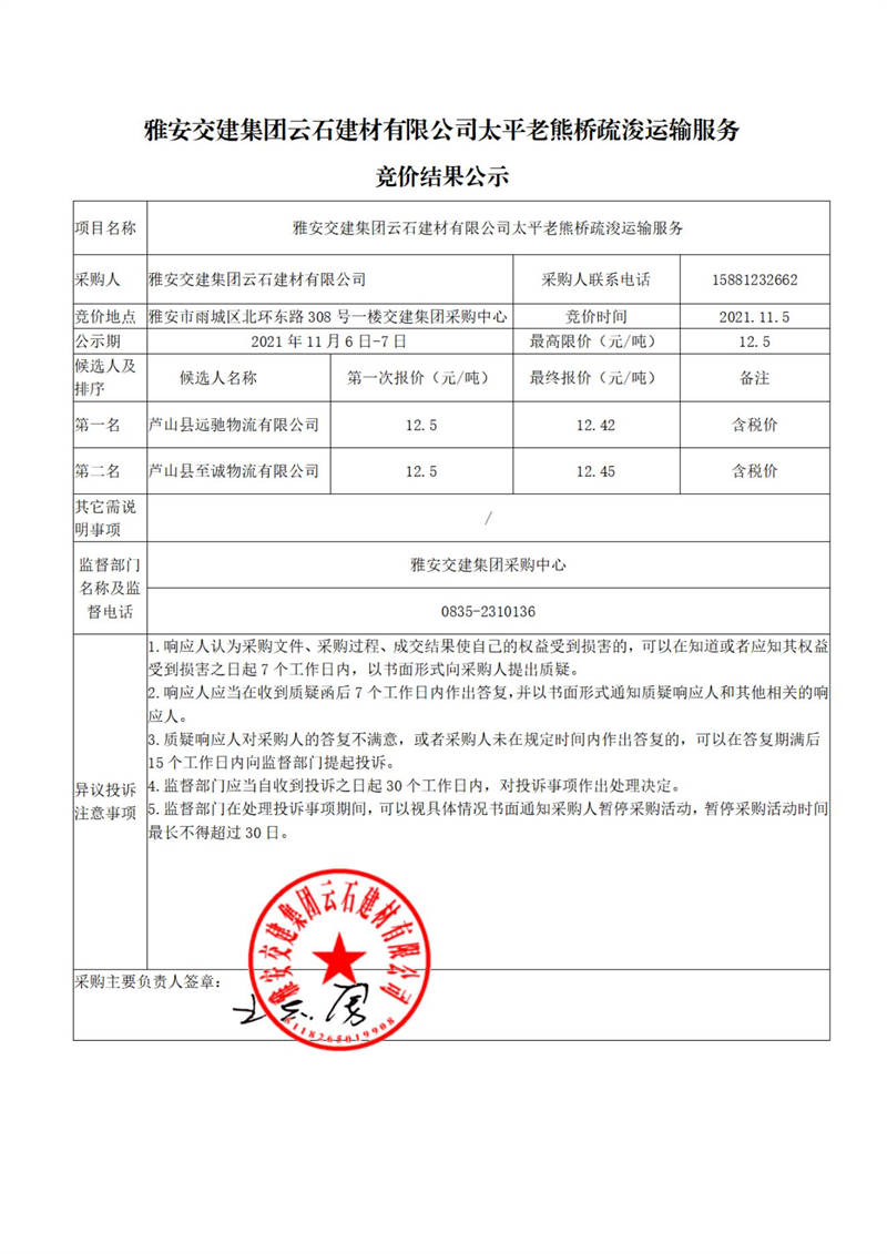 雅安交建集團(tuán)云石建材有限公司太平老熊橋疏浚運(yùn)輸服務(wù)競價(jià)結(jié)果公示