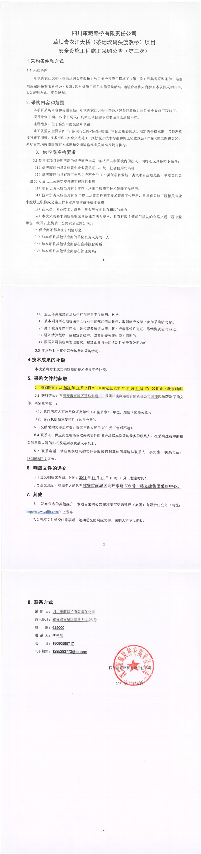 四川康藏路橋有限責任公司草壩青衣江大橋(茶地坎碼頭渡改橋)項目安全設施工程施工采購公告(第二次)