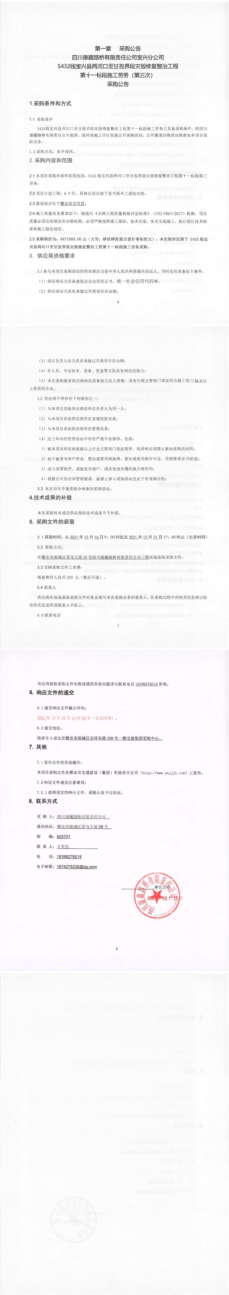 四川康藏路橋有限責(zé)任公司寶興分公司S432線寶興縣兩河口至甘孜界段災(zāi)毀修復(fù)整治工程第十一標(biāo)段施工勞務(wù)(第三次)采購公告