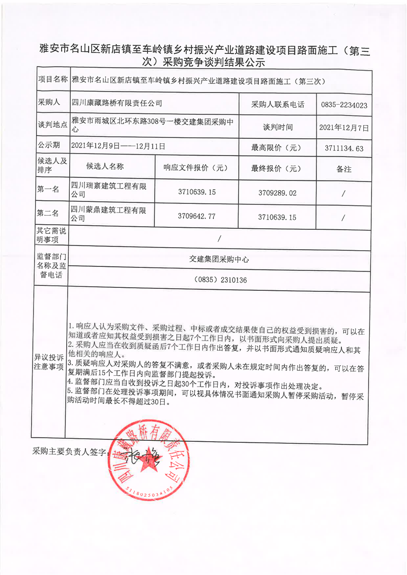 四川康藏路橋有限責(zé)任公司雅安市名山區(qū)新店鎮(zhèn)至車嶺鎮(zhèn)鄉(xiāng)村振興產(chǎn)業(yè)道路建設(shè)項目路面施工(第三次)采購競爭談判結(jié)果公示