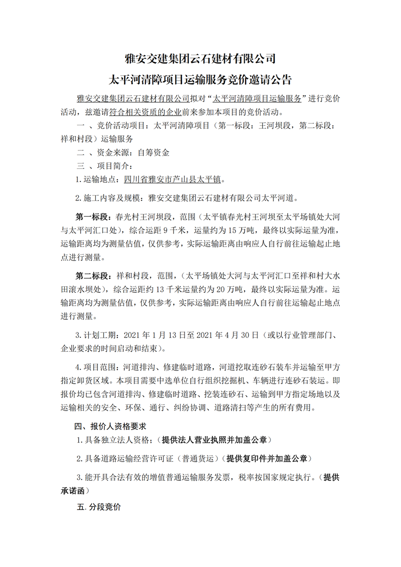 雅安交建集團(tuán)云石建材有限公司太平河清障項(xiàng)目運(yùn)輸服務(wù)競價邀請公告