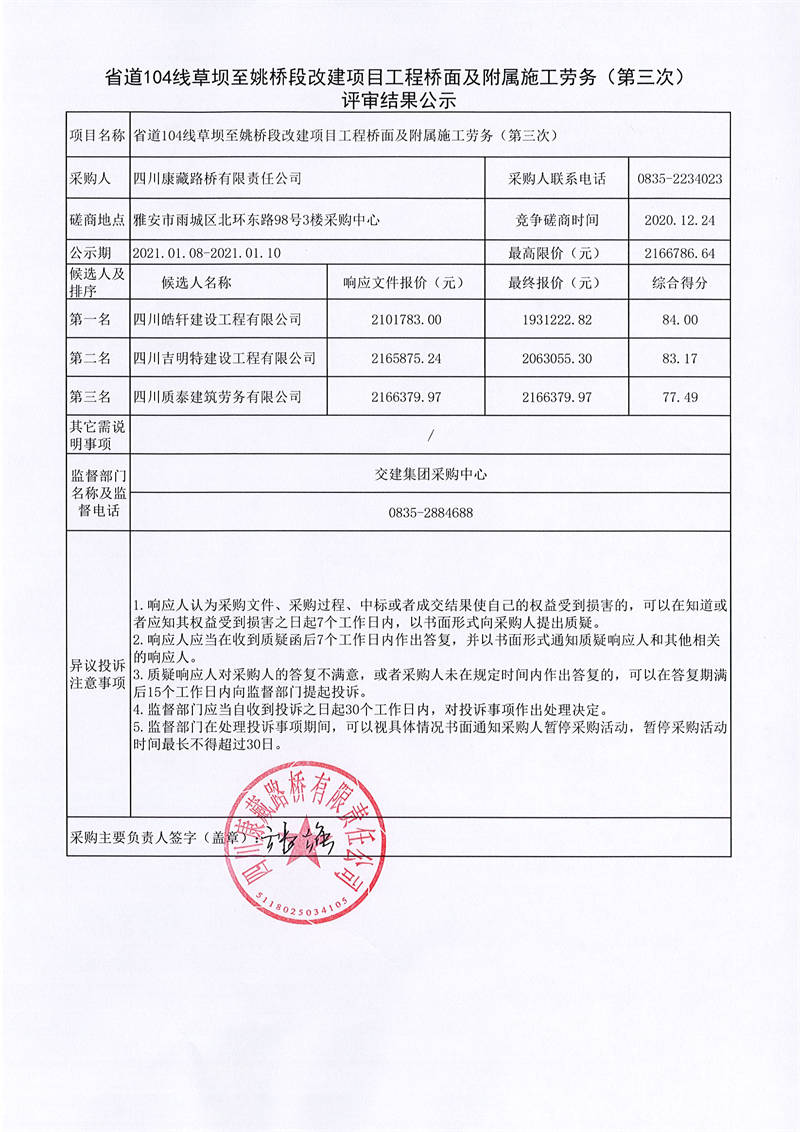 四川康藏路橋有限責(zé)任公司省道104線草壩至姚橋段改建項目工程橋面及附屬施工勞務(wù)(第三次)評審結(jié)果公示