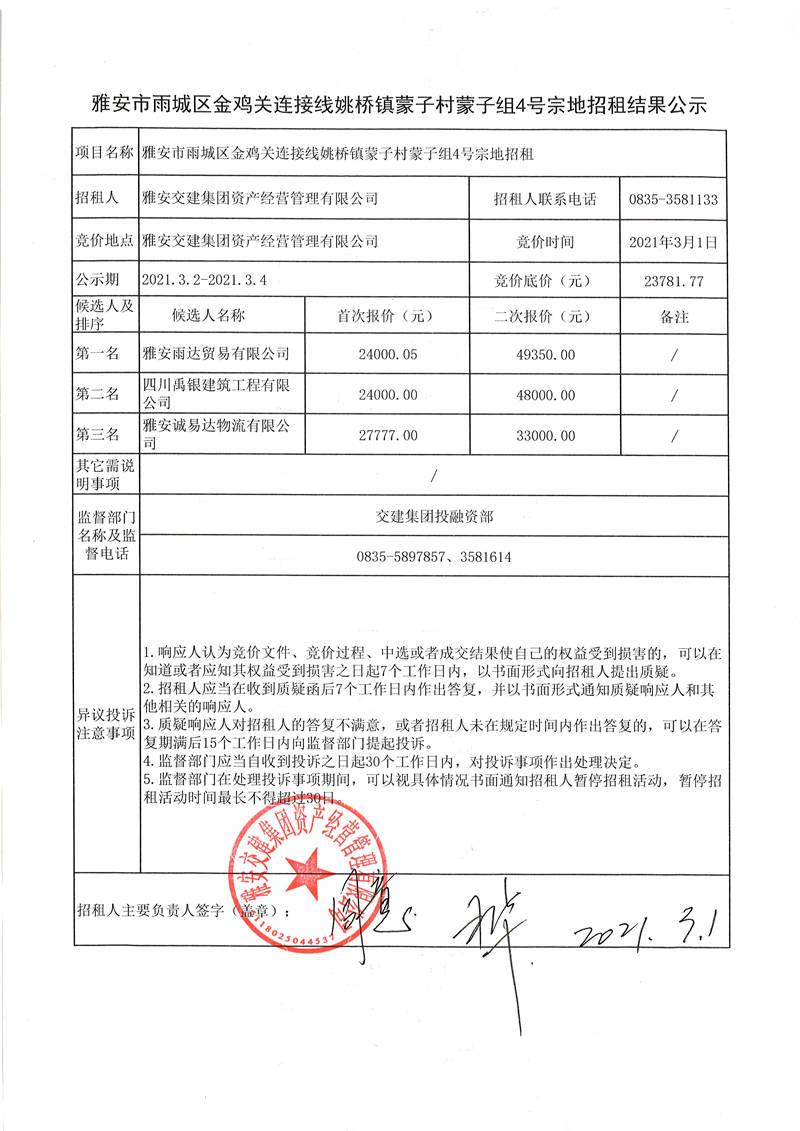 雅安交建集團(tuán)資產(chǎn)經(jīng)營管理有限公司雅安市雨城區(qū)金雞關(guān)連接線姚橋鎮(zhèn)蒙子村蒙子組4號(hào)宗地招租結(jié)果公示