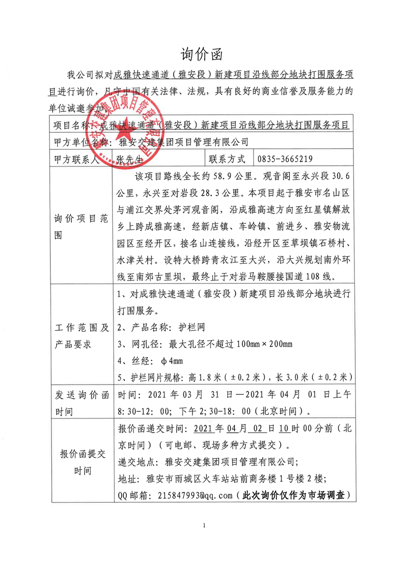 雅安交建集團(tuán)項目管理有限公司成雅快速通道(雅安段)新建項目沿線部分地塊打圍服務(wù)項目詢價函
