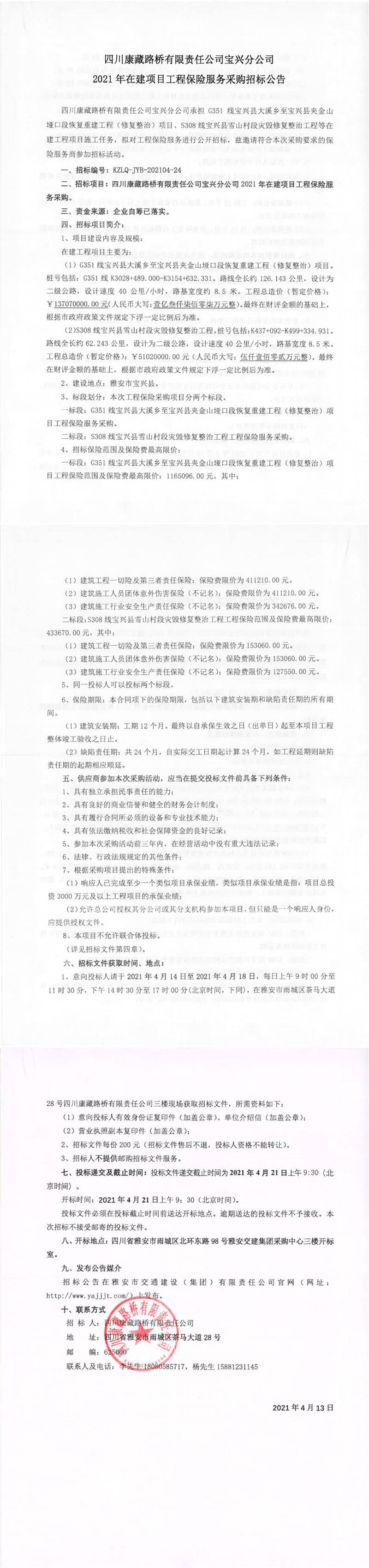 四川康藏路橋有限責(zé)任公司寶興分公司2021年在建項(xiàng)目工程保險服務(wù)采購招標(biāo)公告