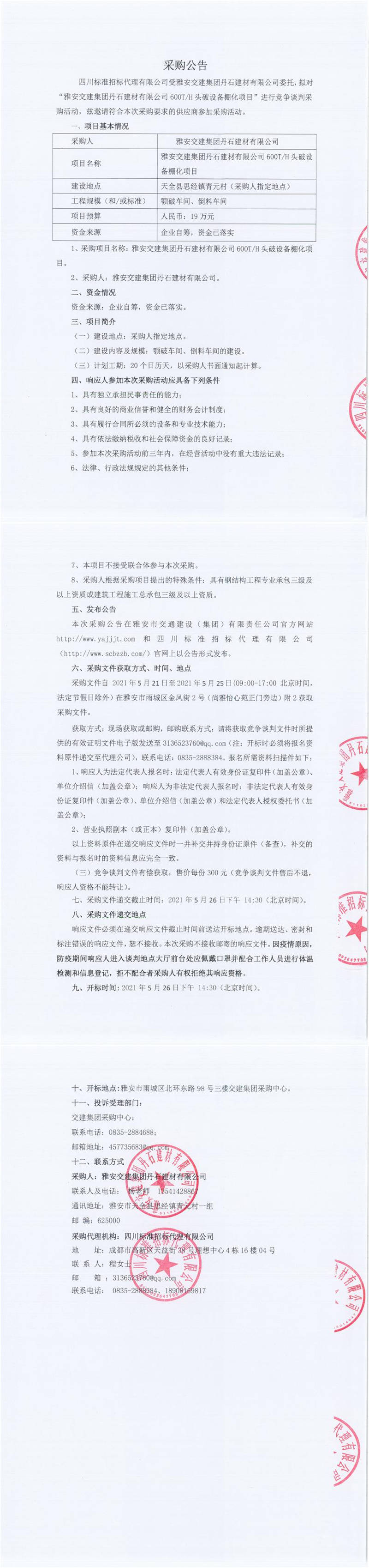 雅安交建集團丹石建材有限公司600T/H頭破設(shè)備棚化項目競爭談判公告