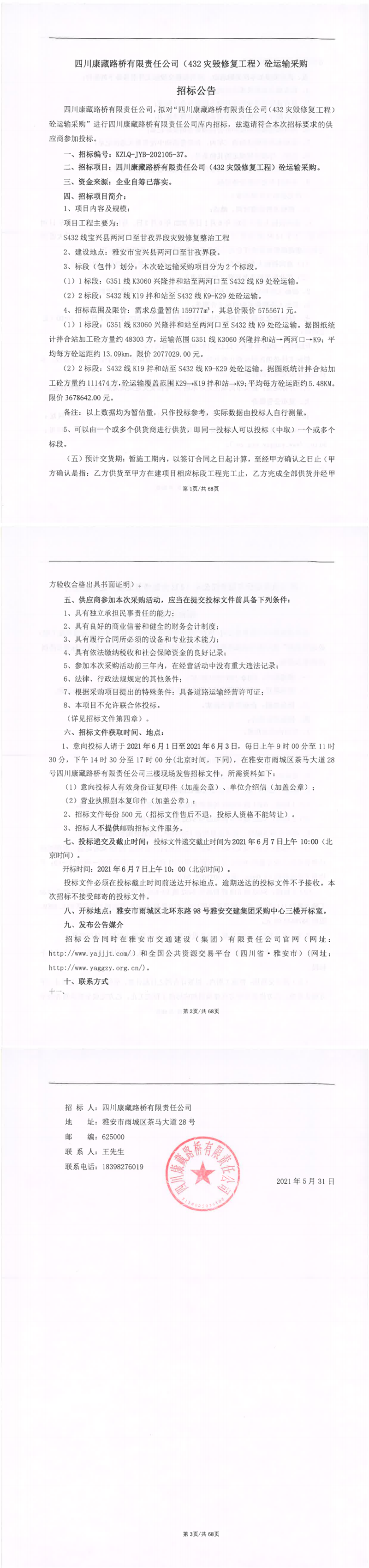 四川康藏路橋有限責(zé)任公司(432災(zāi)毀修復(fù)工程)砼運(yùn)輸采購(gòu)招標(biāo)公告