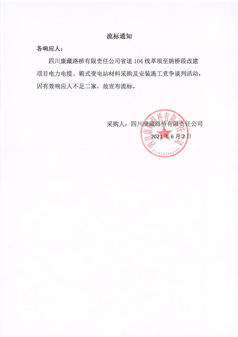 四川康藏路橋有限責(zé)任公司省道104線草壩至姚橋段改建項(xiàng)目電力電纜、箱式變電站材料采購(gòu)及安裝施工競(jìng)爭(zhēng)談判流標(biāo)通知