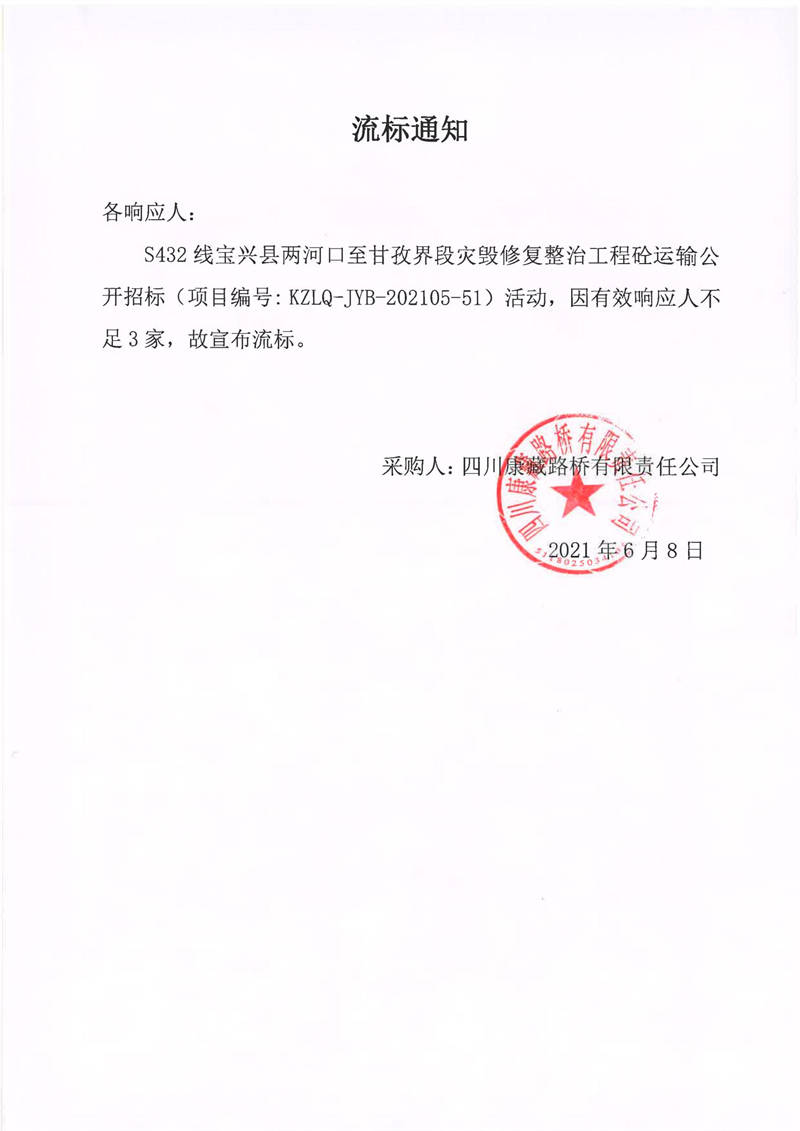四川康藏路橋有限責(zé)任公司S432線寶興縣兩河口至甘孜界段災(zāi)毀修復(fù)整治工程砼運輸流標(biāo)通知