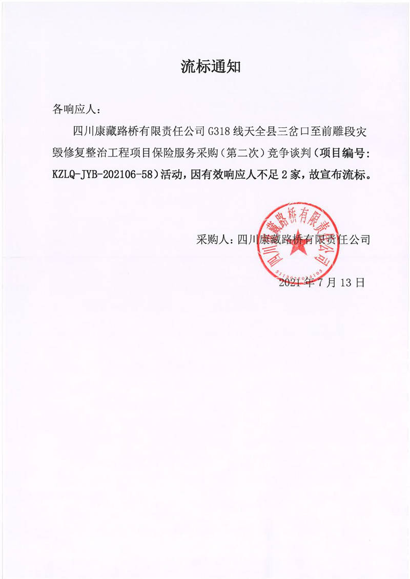 四川康藏路橋有限責任公司G318線天全縣三岔口至前雕段災(zāi)毀修復(fù)整治工程項目保險服務(wù)采購(第二次)流標通知