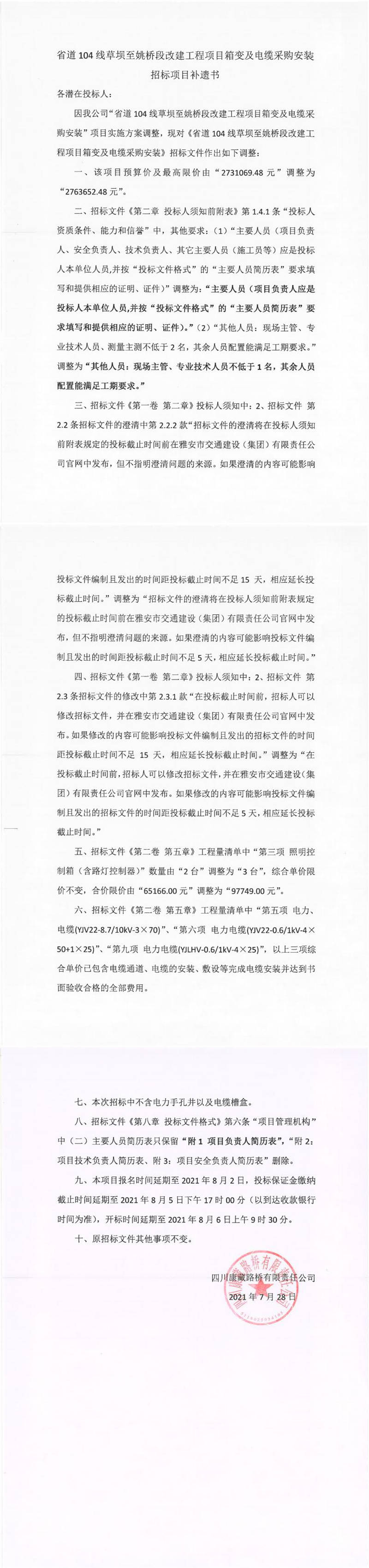 四川康藏路橋有限責任公司省道104線草壩至姚橋段改建項目箱變及電纜采購安裝招標項目補遺書