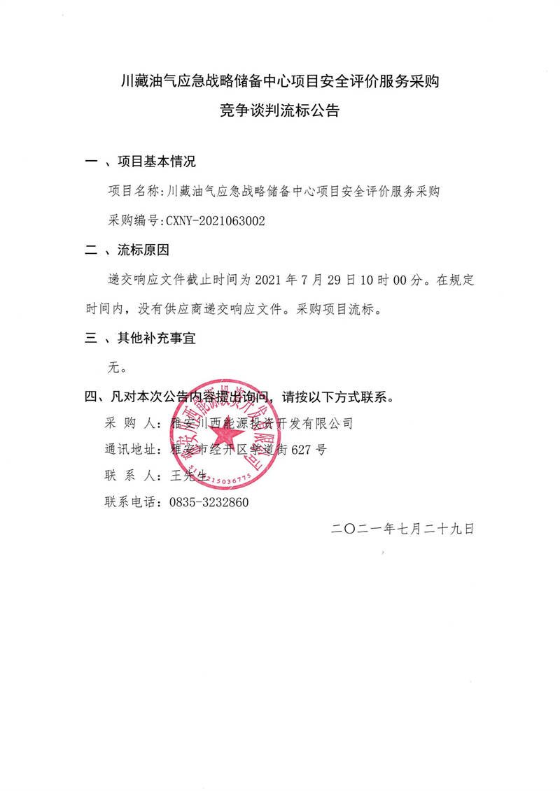 雅安川西能源投資開發(fā)有限公司川藏油氣應急戰(zhàn)略儲備中心項目安全評價服務采購競爭談判流標公告