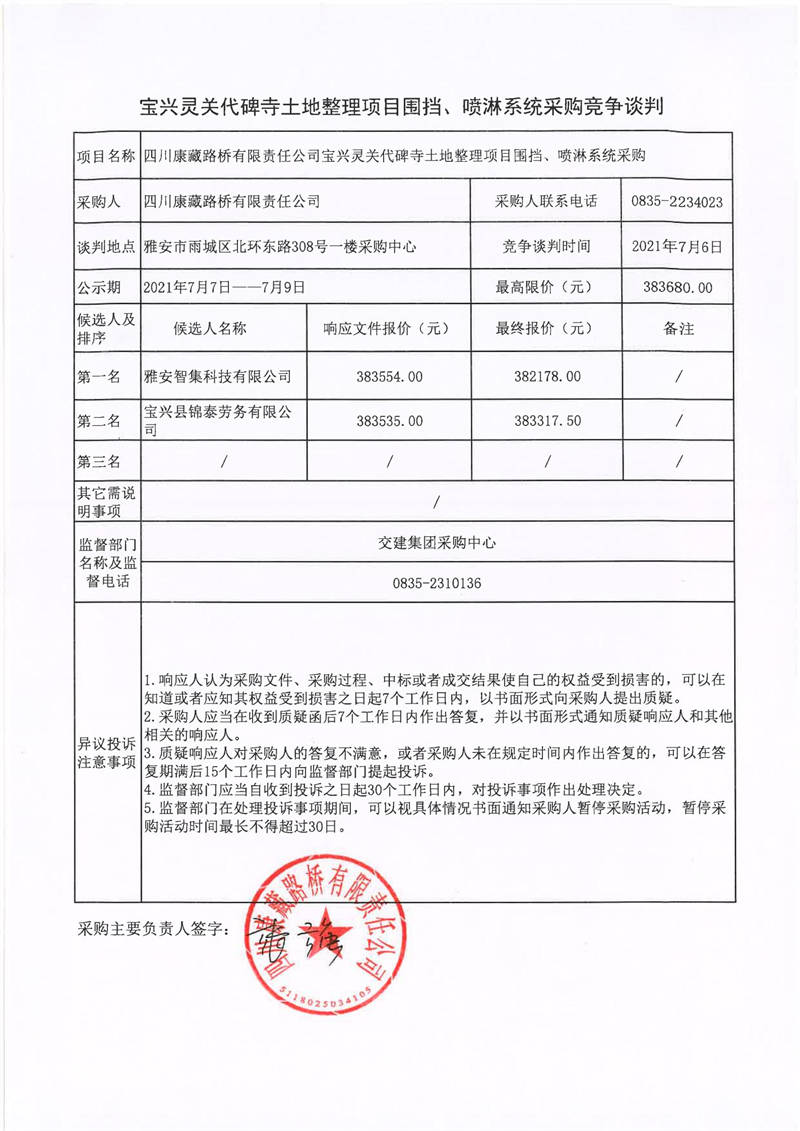 四川康藏路橋有限責(zé)任公司寶興靈關(guān)代碑寺土地整理工程項(xiàng)目圍擋、噴淋系統(tǒng)采購(gòu)競(jìng)爭(zhēng)談判結(jié)果公示