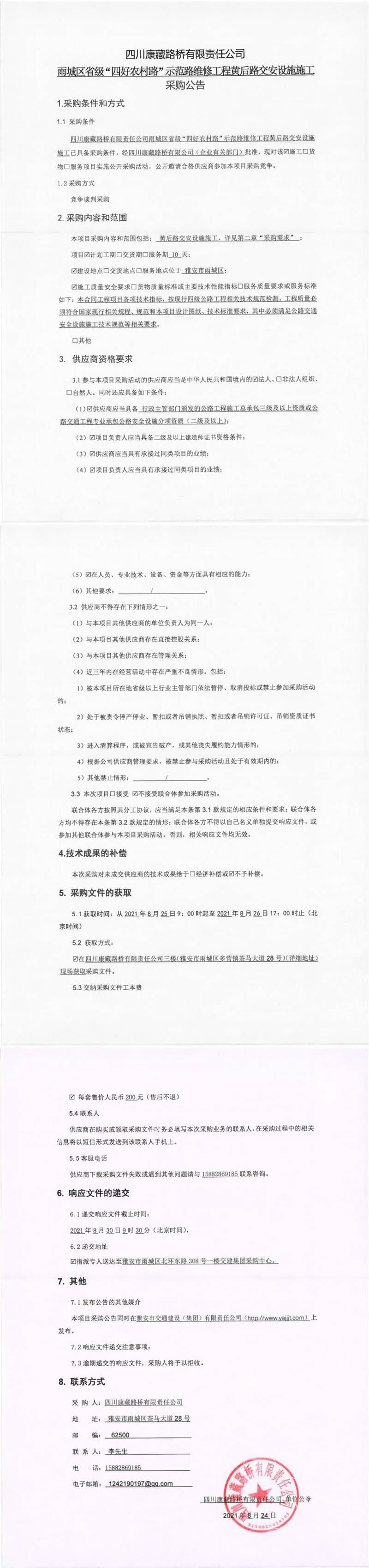 四川康藏路橋有限責(zé)任公司雨城區(qū)省級(jí)“四好農(nóng)村路”示范路維修工程黃后路交安設(shè)施施工采購(gòu)公告