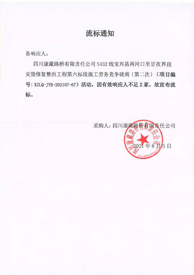 四川康藏路橋有限責(zé)任公司S432線(xiàn)寶興縣兩河口至甘孜界段災(zāi)毀修復(fù)整治工程第六標(biāo)段施工勞務(wù)競(jìng)爭(zhēng)磋商(第二次)流標(biāo)通知