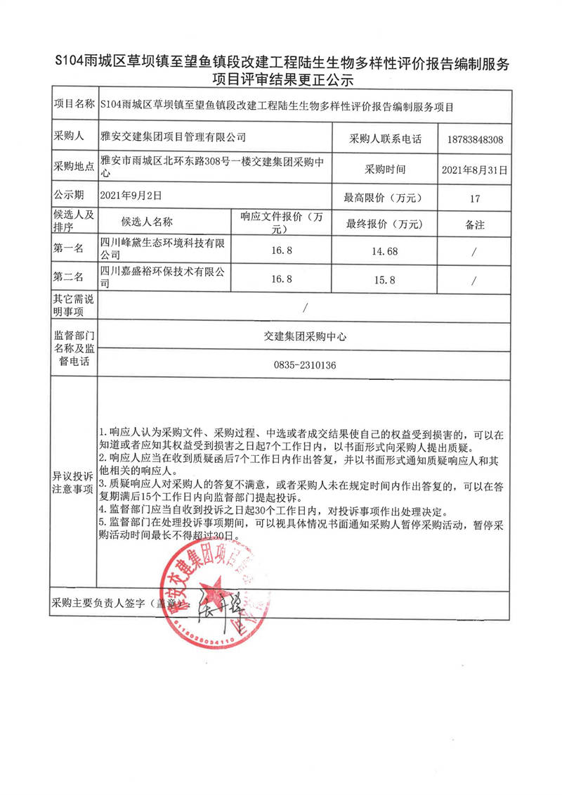 雅安交建集團(tuán)項(xiàng)目管理有限公司S104雨城區(qū)草壩鎮(zhèn)至望魚(yú)鎮(zhèn)段改建工程陸生生物多樣性評(píng)價(jià)報(bào)告編制服務(wù)項(xiàng)目評(píng)審結(jié)果更正公示