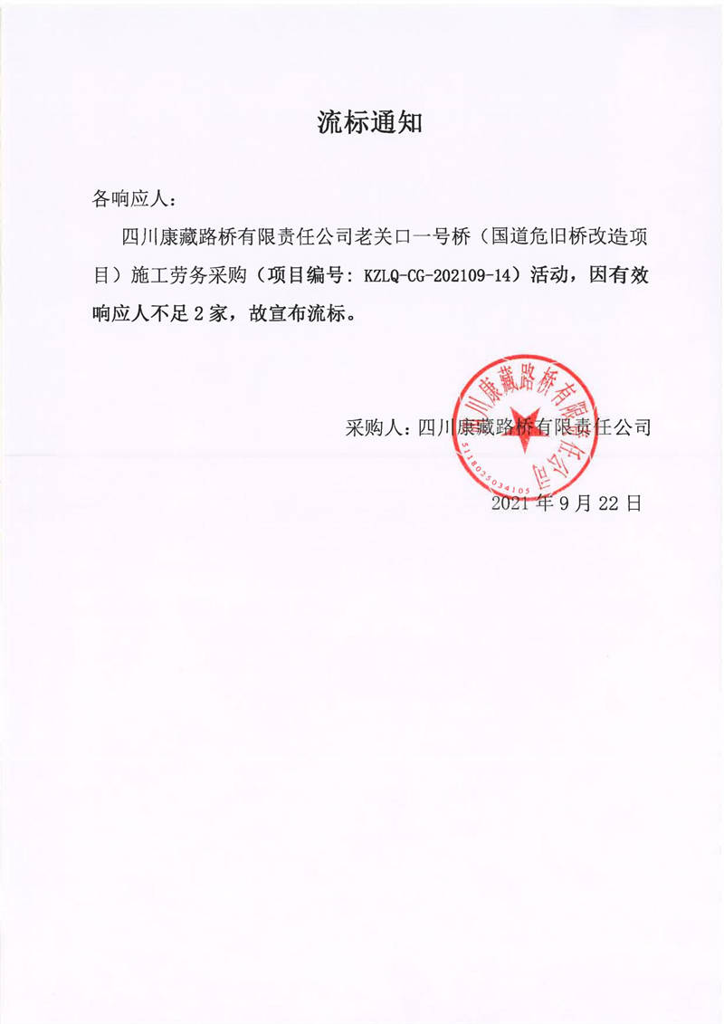 四川康藏路橋有限責(zé)任公司老關(guān)口一號(hào)橋(國道危舊橋改造項(xiàng)目)施工勞務(wù)采購流標(biāo)通知
