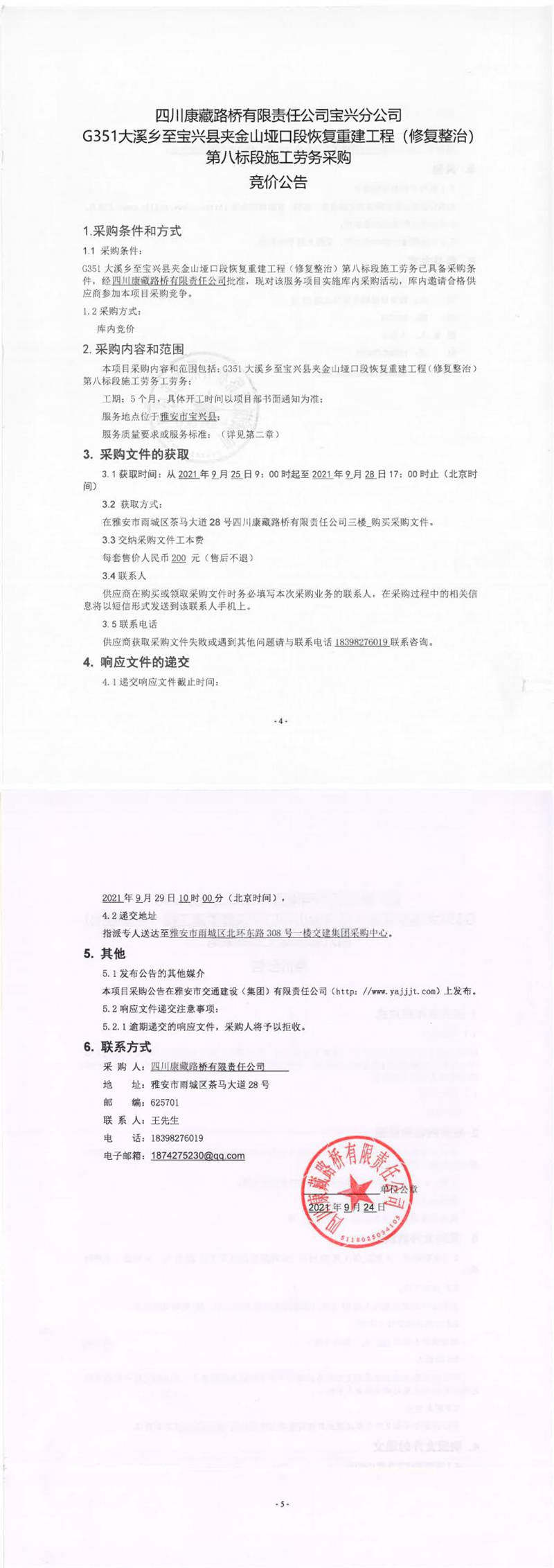 四川康藏路橋有限責任公司寶興分公司G351大溪鄉(xiāng)至寶興縣夾金山埡口段恢復重建工程(修復整治)第八標段施工勞務(wù)采購競價公告