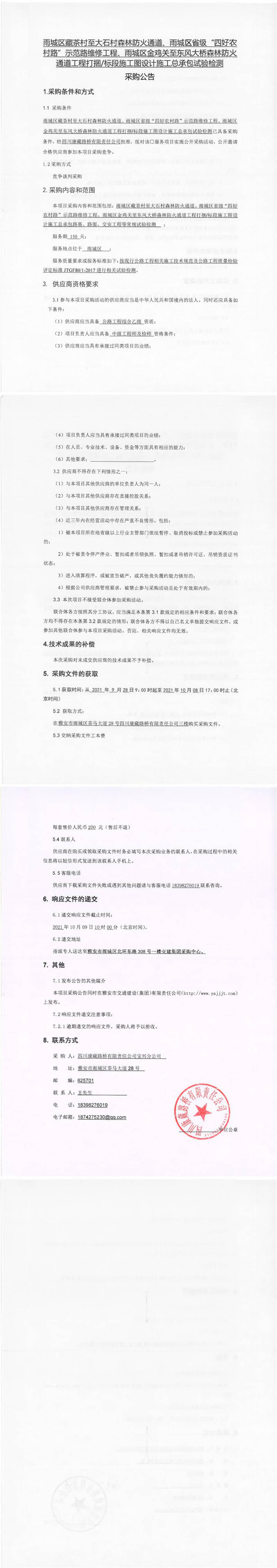 四川康藏路橋有限責(zé)任公司雨城區(qū)藏茶村至大石村森林防火通道、雨城區(qū)省級“四好農(nóng)村路”示范路維修工程、雨城區(qū)金雞關(guān)至東風(fēng)大橋森林防火通道工程打捆/標(biāo)段施工圖設(shè)計施工總承包試驗檢測采購公告