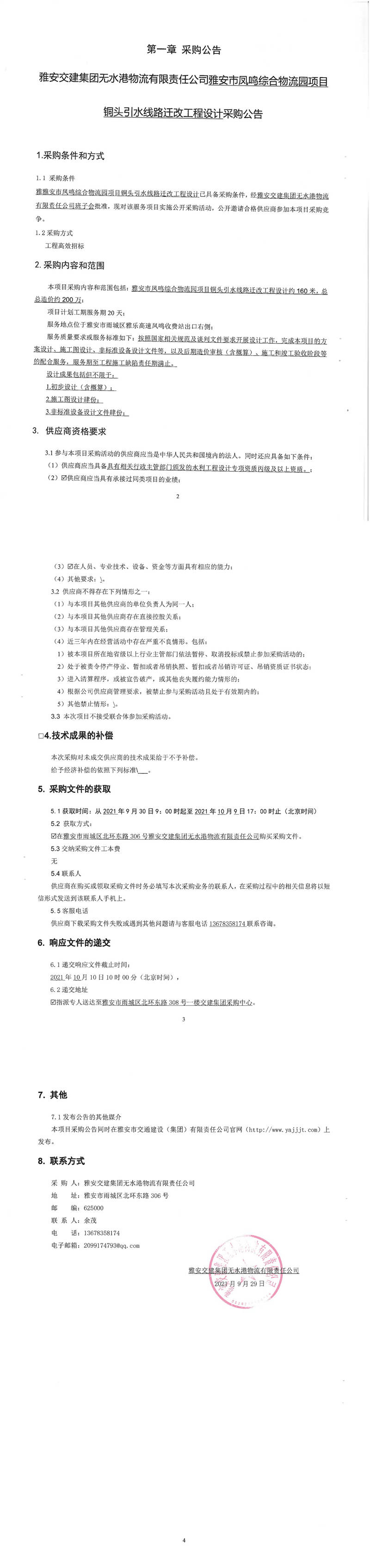 雅安交建集團(tuán)無水港物流有限責(zé)任公司雅安市鳳鳴綜合物流園項(xiàng)目銅頭引水線路遷改工程設(shè)計(jì)采購公告