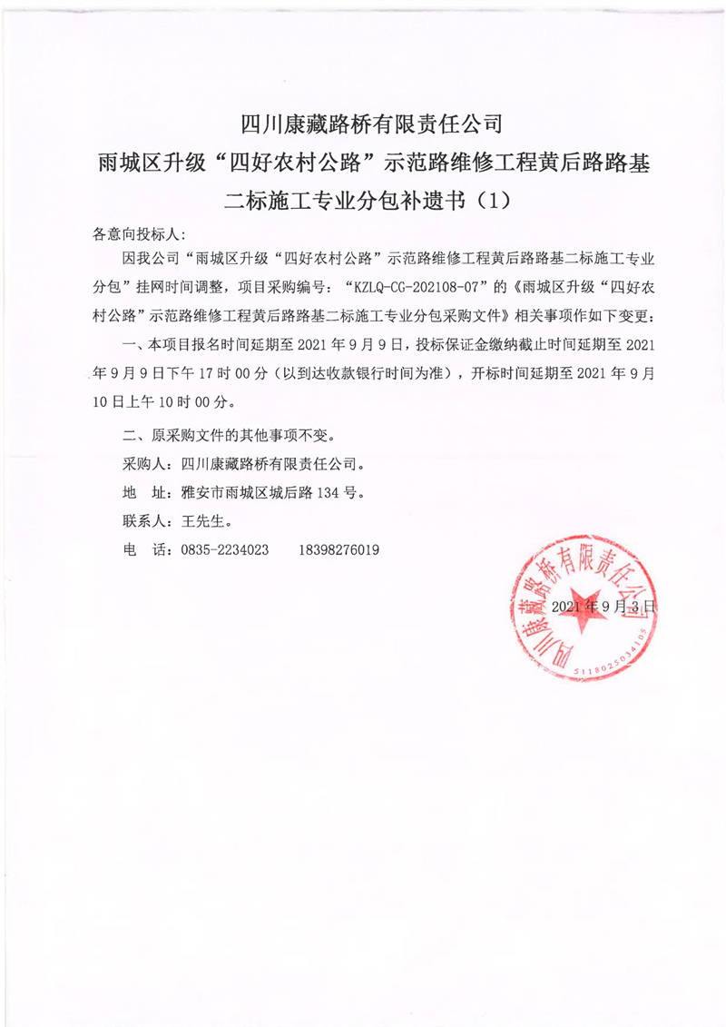 四川康藏路橋有限責(zé)任公司雨城區(qū)升級(jí)“四好農(nóng)材公路”示范路維修工程黃后路路基二標(biāo)施工專(zhuān)業(yè)分包補(bǔ)遺書(shū)(1)