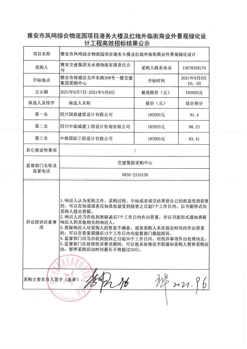 雅安交建集團(tuán)無水港物流有限責(zé)任公司雅安市鳳鳴綜合物流園項目港務(wù)大樓及紅線外臨街商業(yè)外景觀綠化設(shè)計工程高效招標(biāo)結(jié)果公示