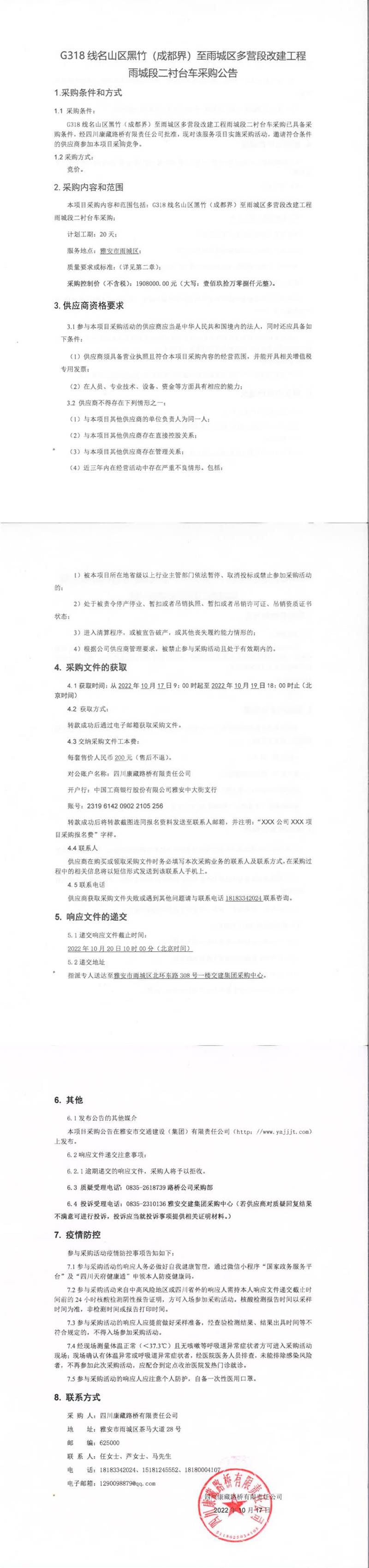 四川康藏路橋有限責(zé)任公司G318線名山區(qū)黑竹(成都界)至雨城區(qū)多營段改建工程雨城段二襯臺(tái)車采購公告