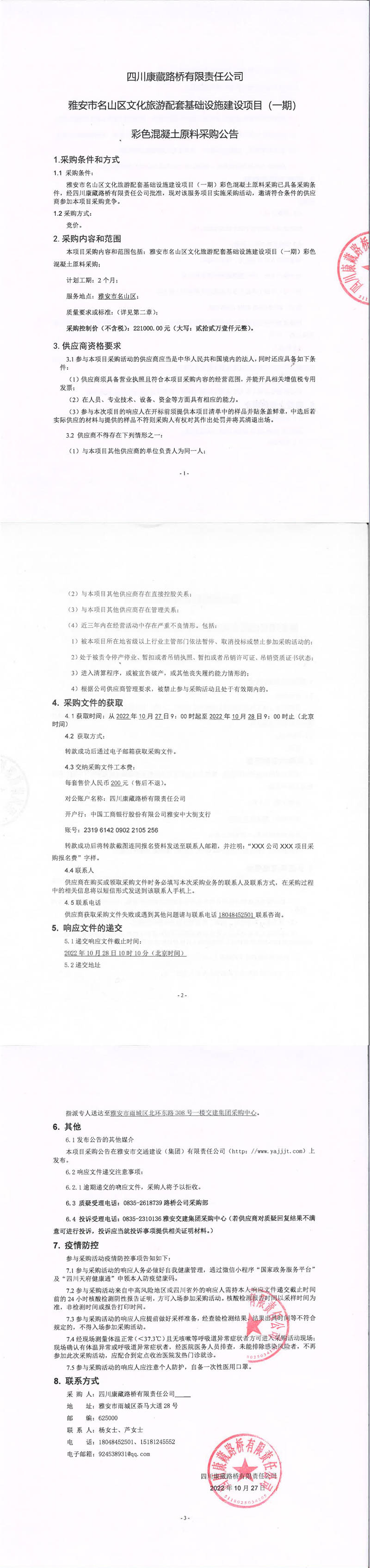 四川康藏路橋有限責(zé)任公司雅安市名山區(qū)文化旅游配套基礎(chǔ)設(shè)施建設(shè)項(xiàng)目(一期)彩色混凝土原料采購公告