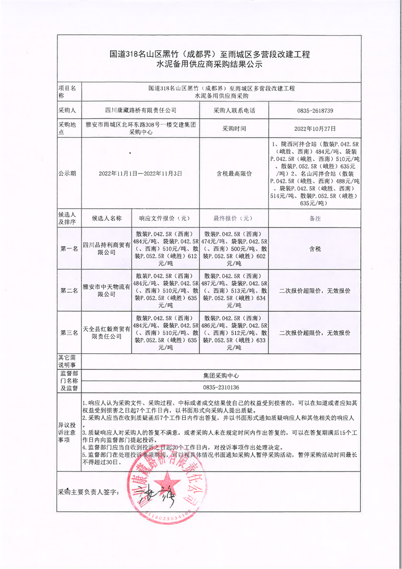 四川康藏路橋有限責任公司國道318名山區(qū)黑竹(成都界)至雨城區(qū)多營段改建工程水泥備用供應商采購結果公示