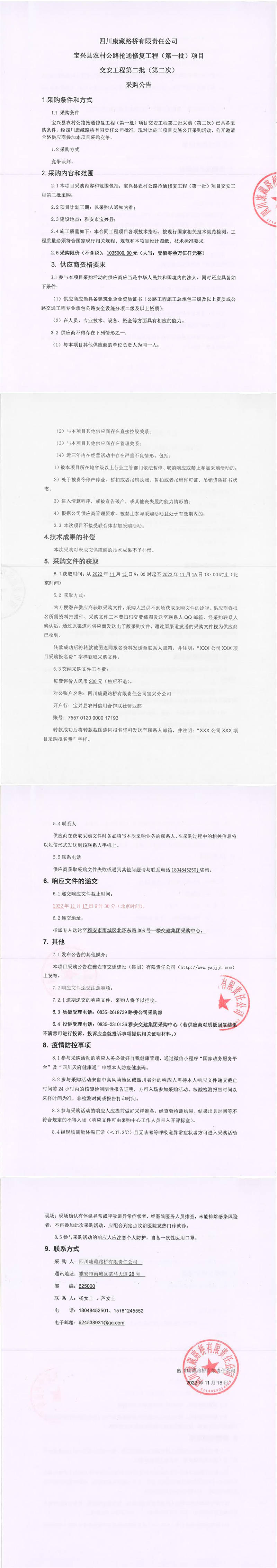 四川康藏路橋有限責任公司寶興縣農村公路搶通修復工程(第一批)項目交安工程第二批(第二次)采購公告