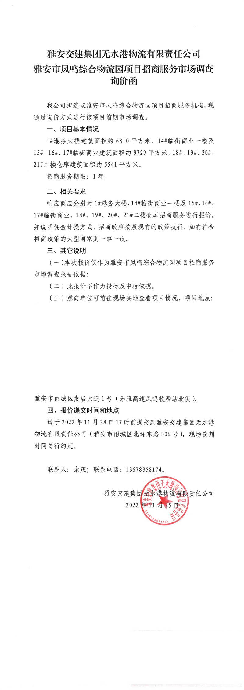 雅安交建集團(tuán)無(wú)水港物流有限責(zé)任公司雅安市鳳鳴綜合物流園項(xiàng)目招商服務(wù)市場(chǎng)調(diào)查詢(xún)價(jià)函
