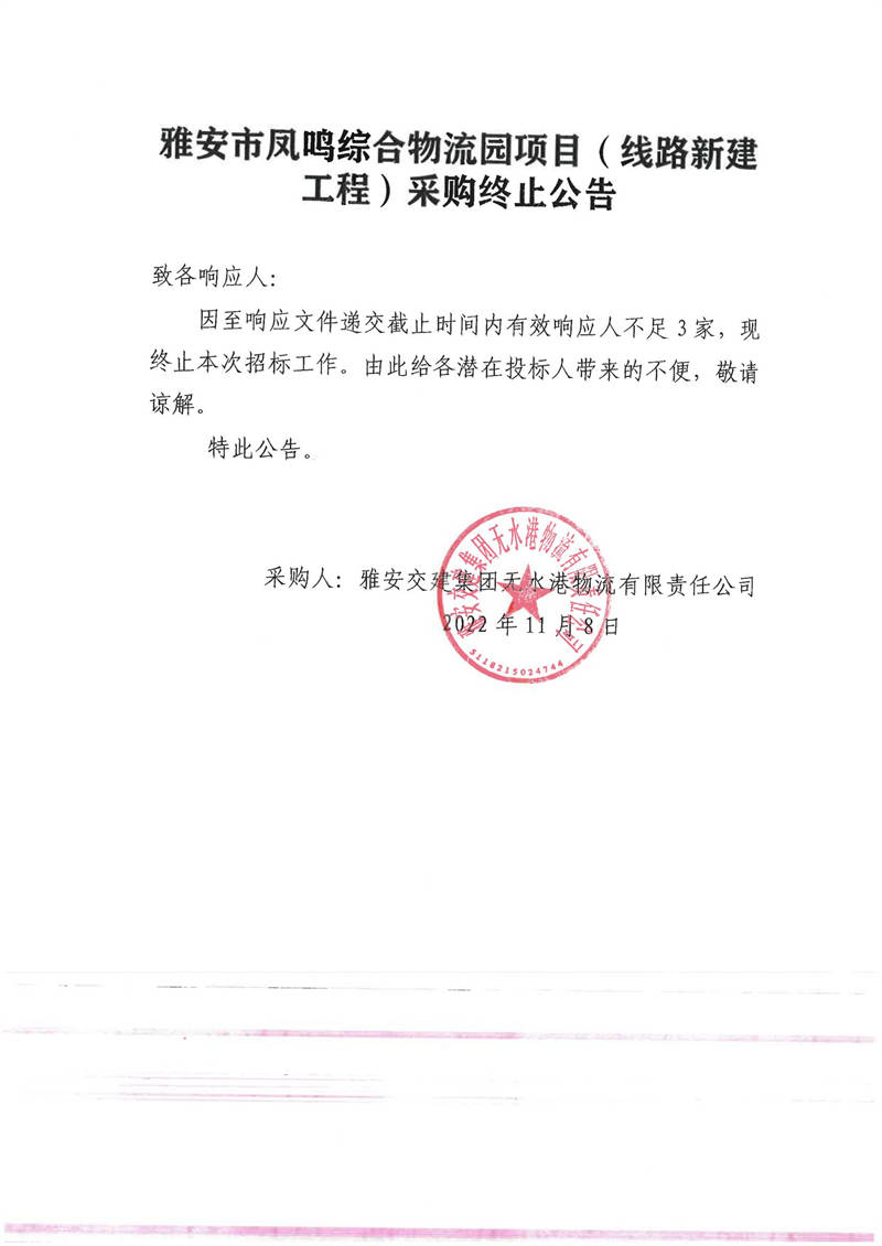 雅安交建集團(tuán)無水港物流有限責(zé)任公司雅安市鳳鳴綜合物流園項目(線路新建工程)采購終止公告