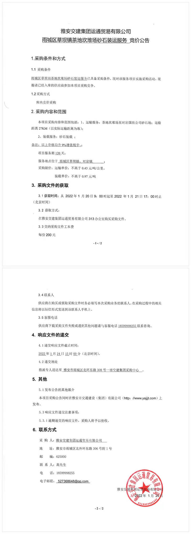 雅安交建集團運通貿易有限公司雨城區(qū)草壩鎮(zhèn)茶地坎堆場砂石裝運服務競價公告