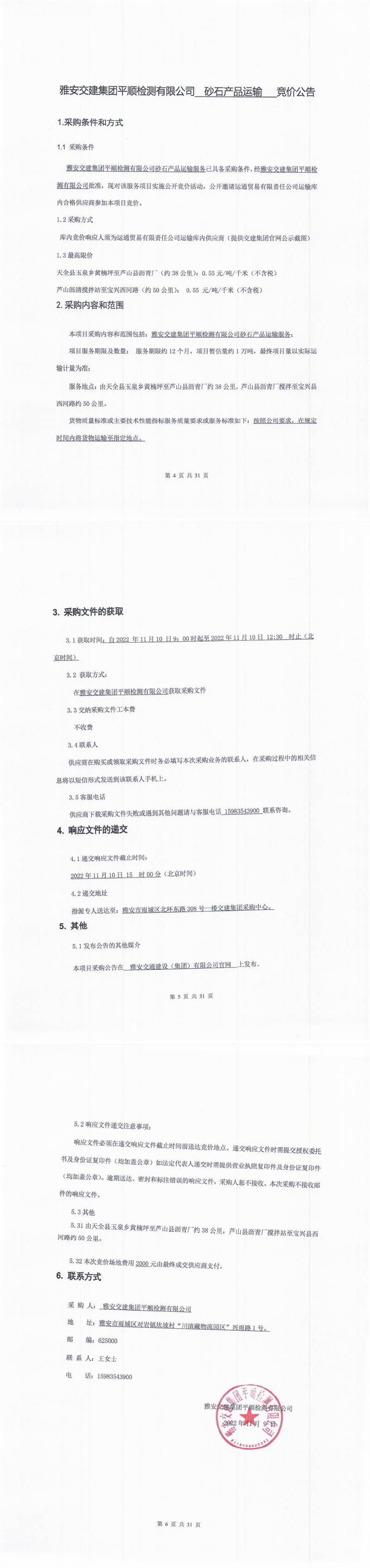 雅安交建集團(tuán)平順檢測有限公司砂石產(chǎn)品運(yùn)輸競價(jià)公告