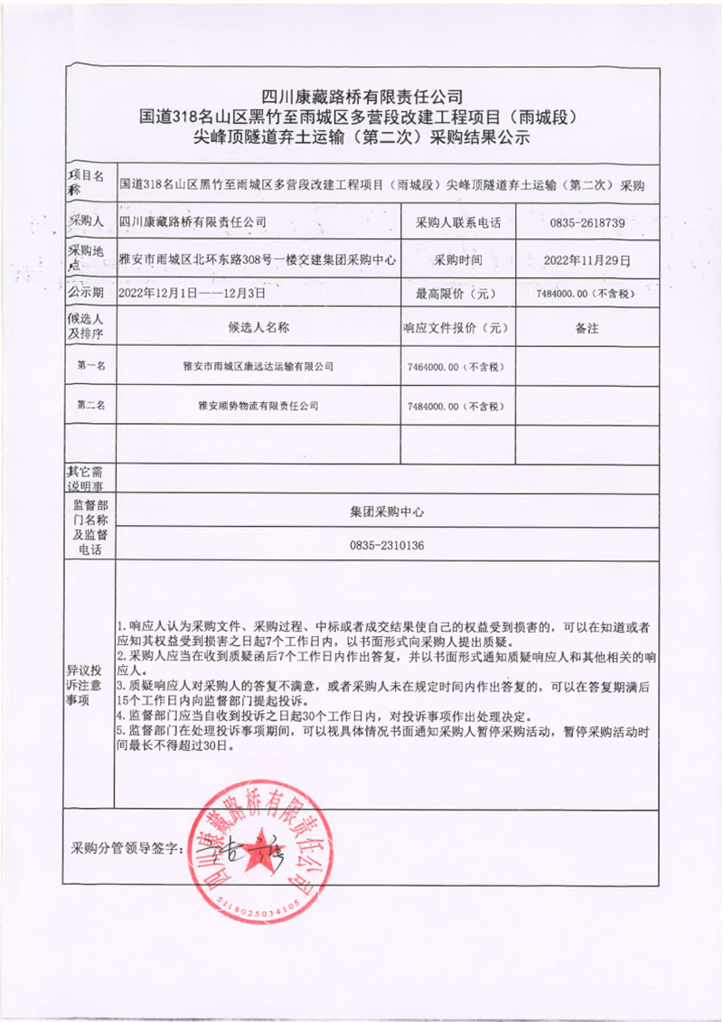 四川康藏路橋有限責(zé)任公司國道318名山區(qū)黑竹至雨城區(qū)多營段改建工程項目(雨城段)尖峰頂隧道棄土運(yùn)輸(第二次)采購結(jié)果公示