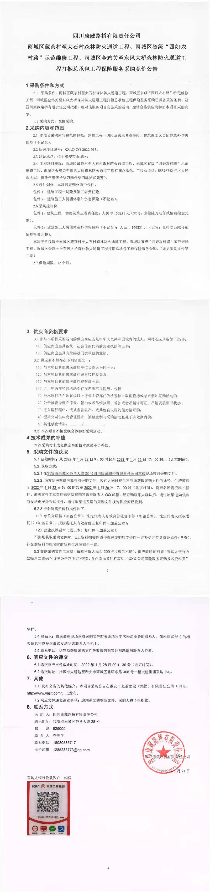 四川康藏路橋有限責(zé)任公司雨城區(qū)藏茶村至大石村森林防火通道工程、雨城區(qū)省級“四好農(nóng)村路”示范維修工程、雨城區(qū)金雞關(guān)至東風(fēng)大橋森林防火通道工程打捆總承包工程保險(xiǎn)服務(wù)采購競價(jià)公告