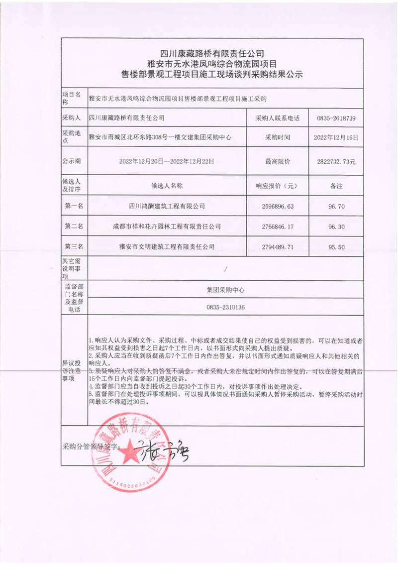 四川康藏路橋有限責(zé)任公司雅安市無水港鳳鳴綜合物流園項(xiàng)目售樓部景觀工程施工現(xiàn)場(chǎng)談判采購結(jié)果公示