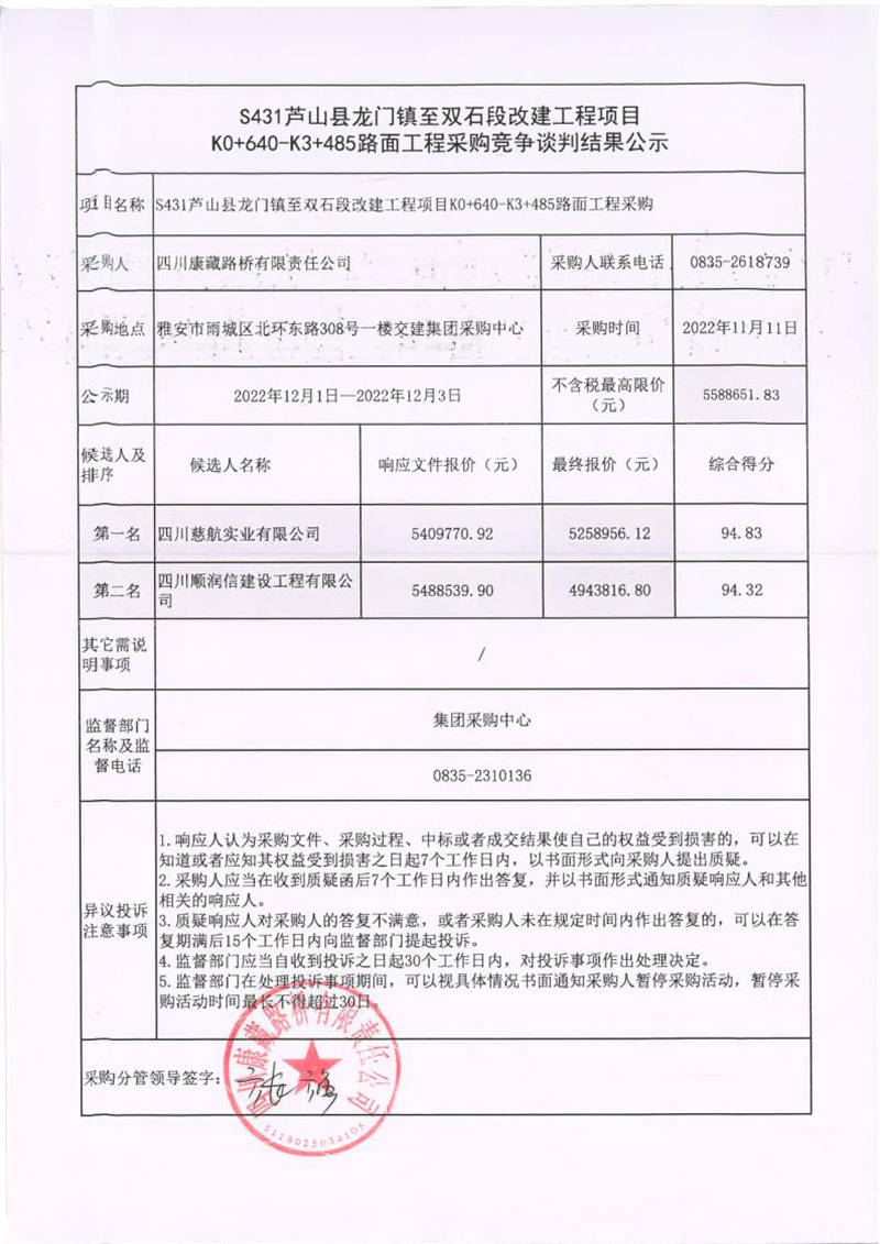 四川康藏路橋有限責任公司S431蘆山縣龍門鎮(zhèn)至雙石段改建工程項目K0+640-K3+485路面工程采購競爭談判結果公示