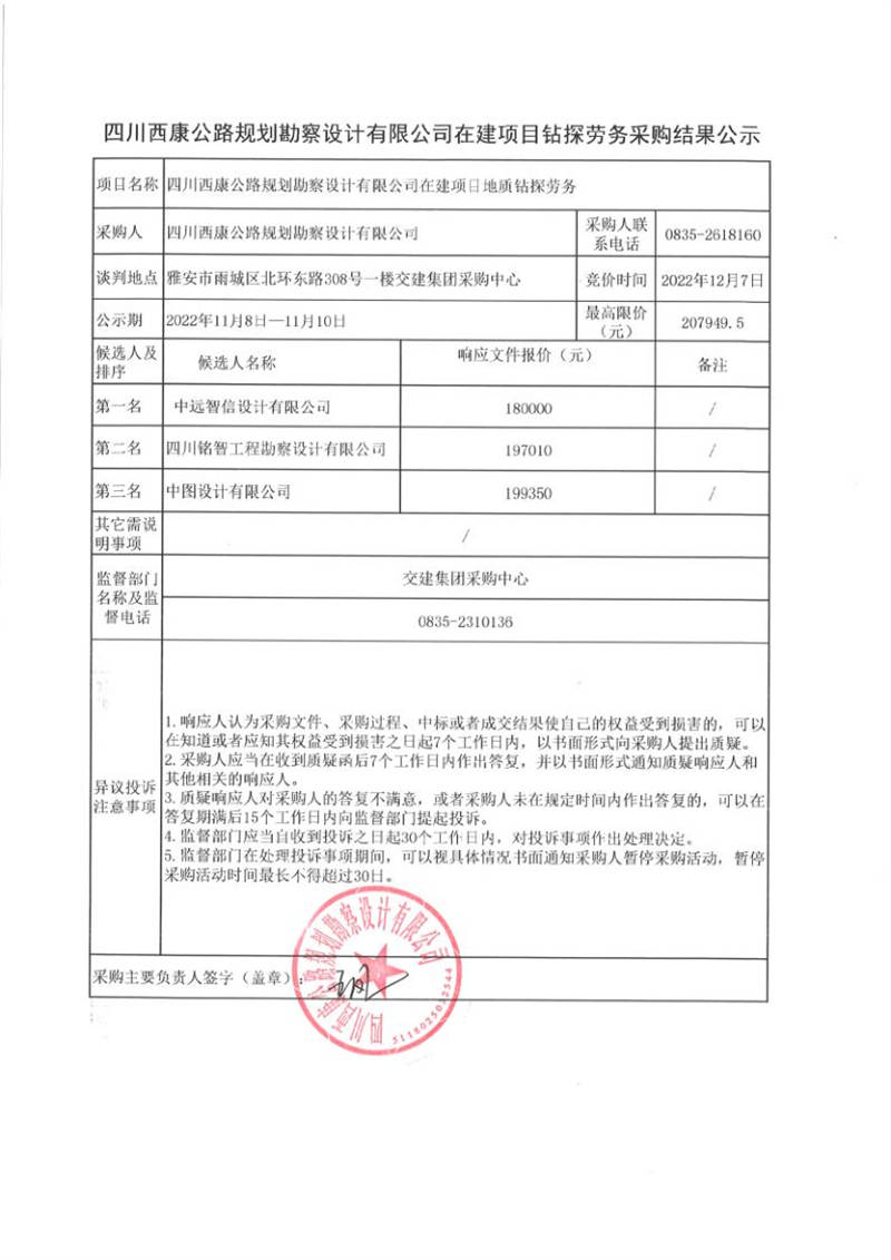 四川西康公路規(guī)劃勘察設(shè)計(jì)有限公司在建項(xiàng)目地質(zhì)鉆探勞務(wù)采購結(jié)果公示