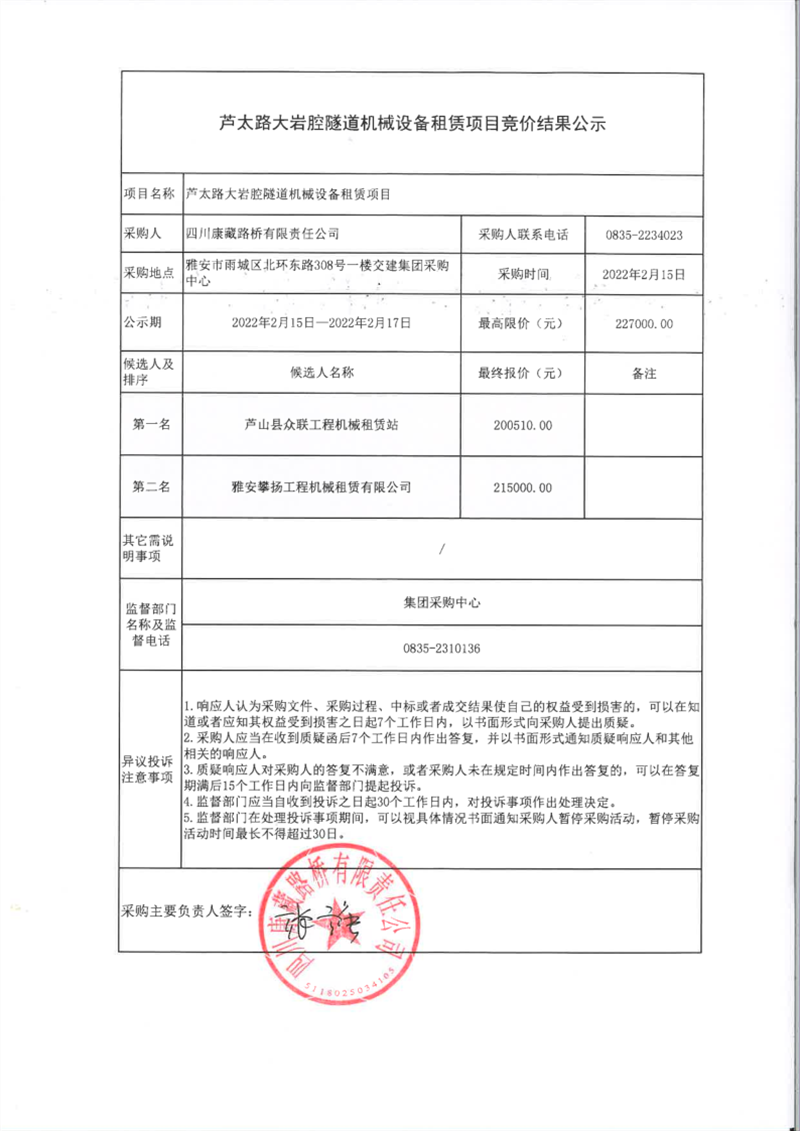 四川康藏路橋有限責任公司蘆太路大巖腔隧道機械設(shè)備租賃項目競價結(jié)果公示